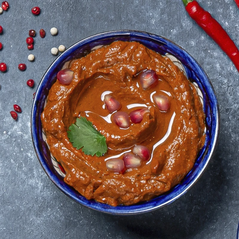 Сирийское мезе - пюре из печеного перца и томатов с орехами и специями.