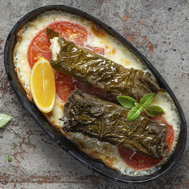 Судак в виноградных листьях с запеченными томатами и сулугуни