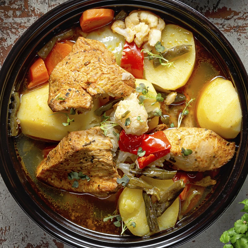 Тажин с индейкой, картофелем, сладким перцем, луком и цветной капустой
