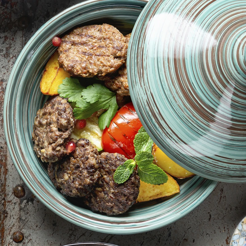 Тажин с кефте из говядины, кефте из баранины, овощами гриль с картофелем