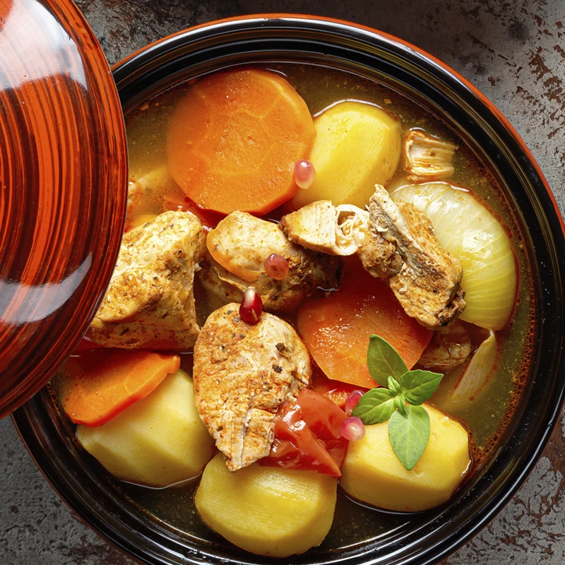 Тажин с курицей, картофелем, томатами, луком, сладким перцем