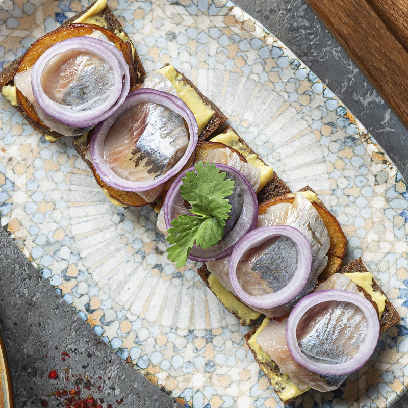 Филе сельди на бородинском хлебе с горчицей и картофелем.