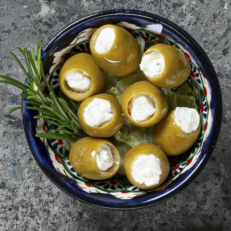 Турецкие оливки с розмарином, брынзой и чесночным маслом.